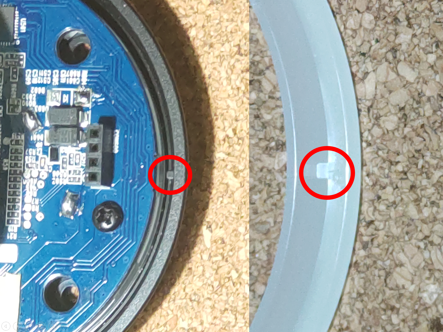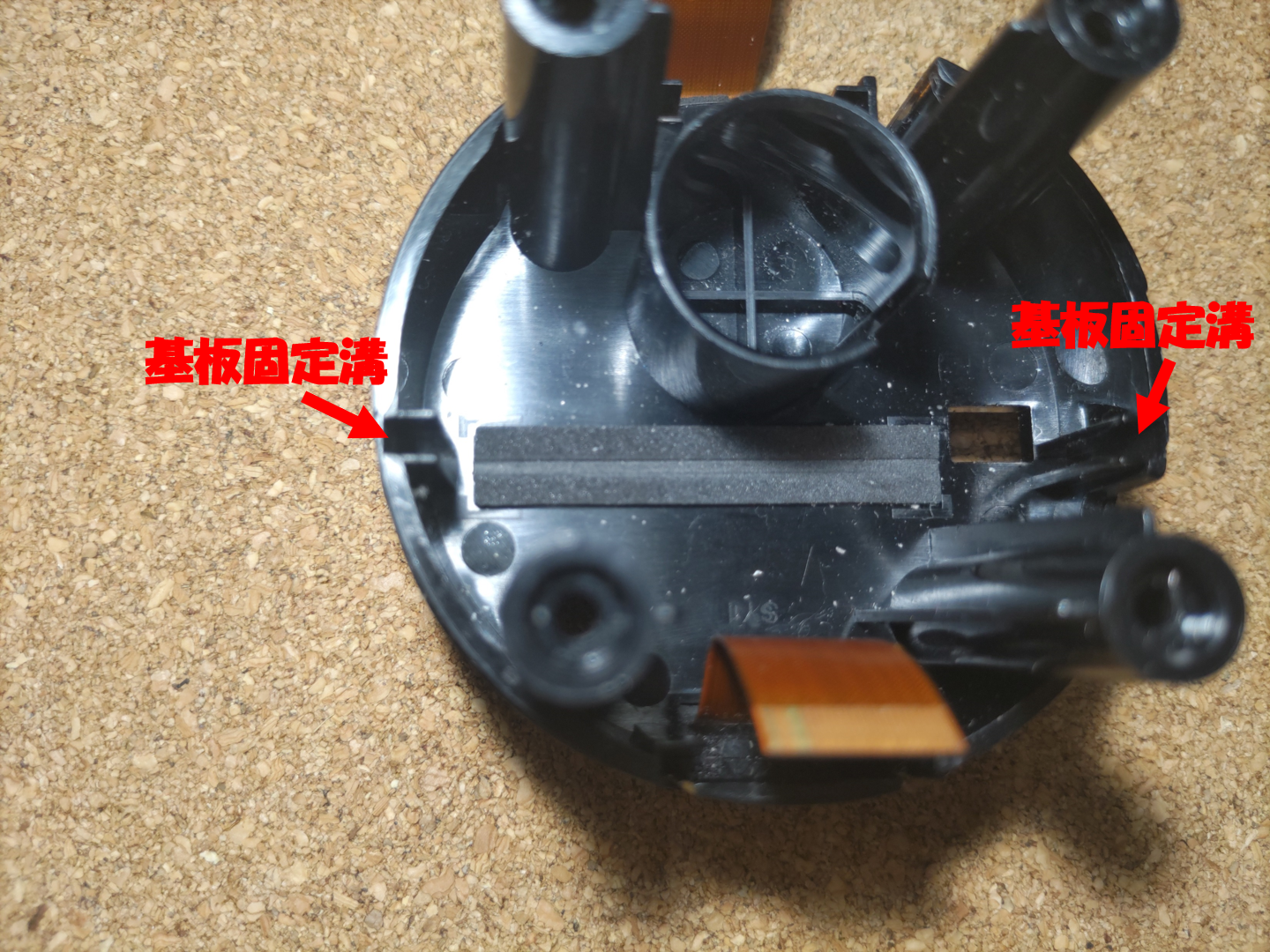 写真の赤〇箇所の爪と溝が合うように回転させてはめ込みます。丁度の角度にしないと奥まで入らずにぐらぐらして、底面がちゃんと閉まらなくなりますので、注意です。