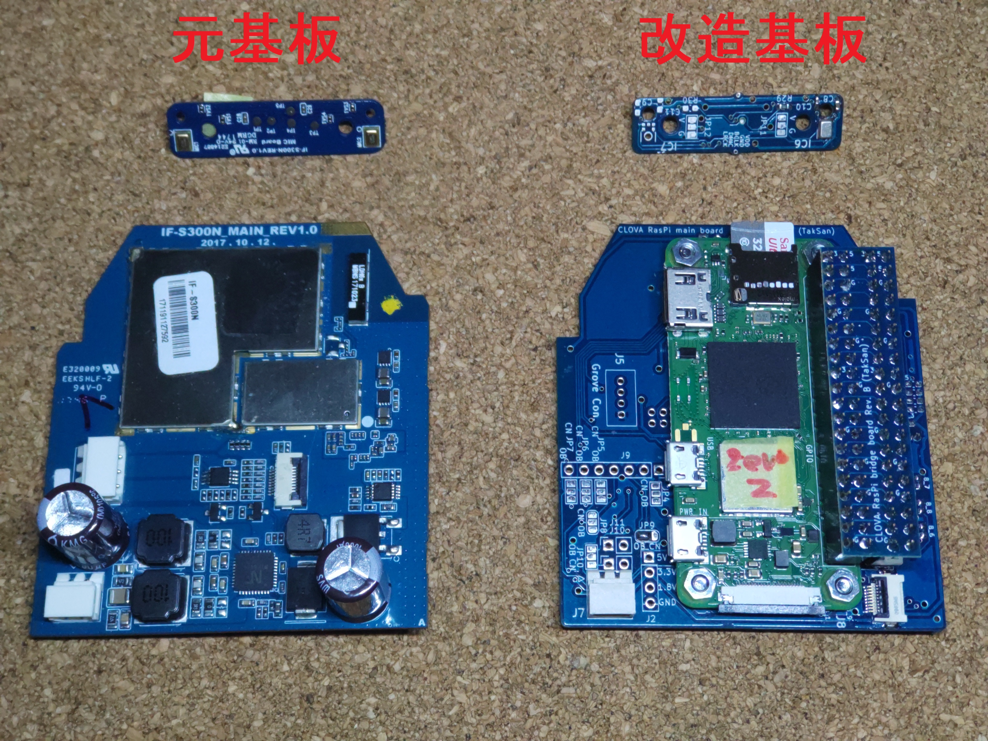 本改造用に専用に製作した改造用基板です。ラズパイZeroを装着し、CLOVA に最初からついていた部品を2つ程外して、ケーブルでつなぐだけで装着できる形にデザインしています。
