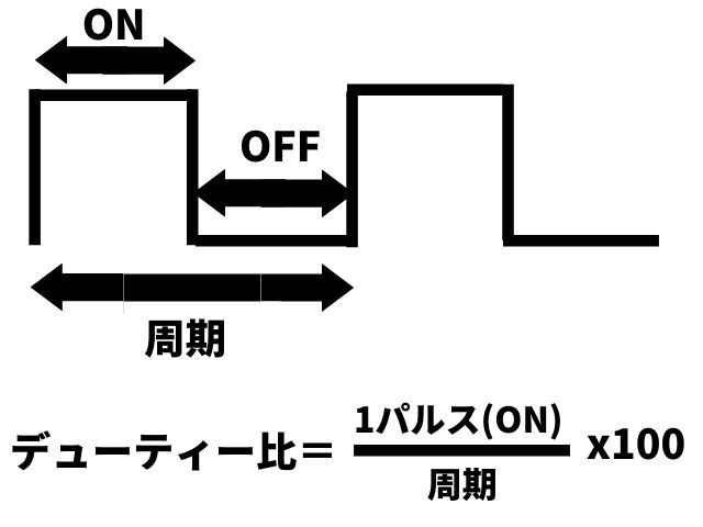 デューティ比=1パルス(ONの時間)÷1周期(ONとOFFの時間)×100