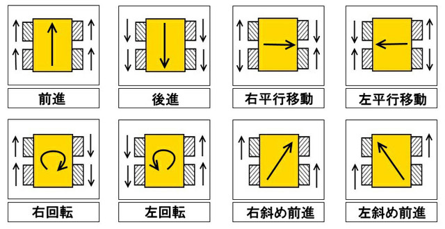 4輪駆動で各タイヤに正転、後転、停止の制御をかければ、組み合わせに応じて図のような動作が再現できます。今回は全ての方向を網羅させたいので、図に左下と右下、停止を加えた「11パターン」の組み合わせを作ります。