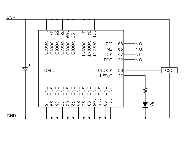 このCPLDは構造的にフラッシュメモリなので、回路の書き込み時にわりと電力を消費し、動作が不安定になることがあります。その対策のためにコンデンサを接続します。