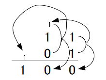 次に、一つ隣の上位bitの計算をします。ここでは、「1」と「0」と「繰り上がってきた1」の加算します。