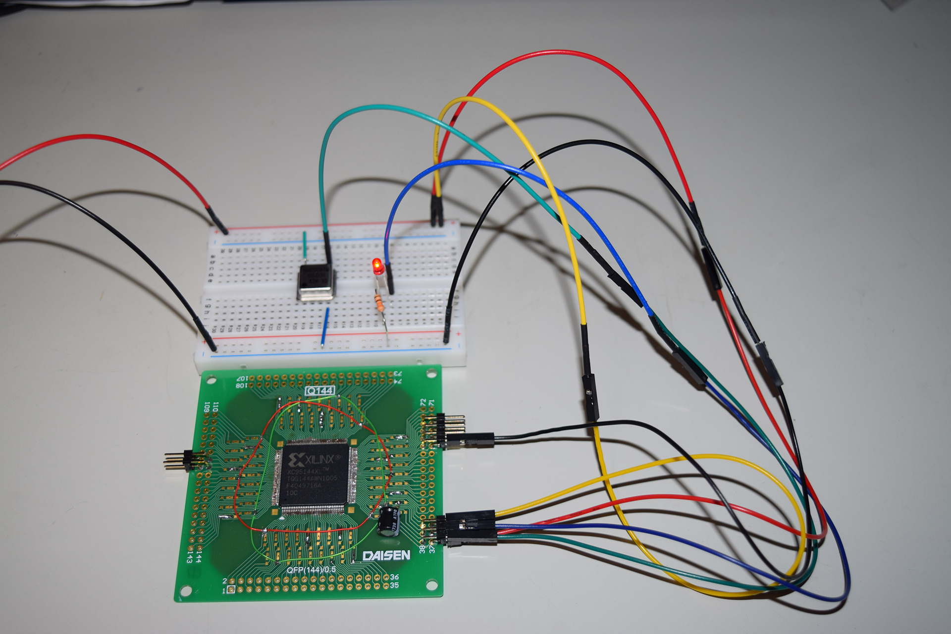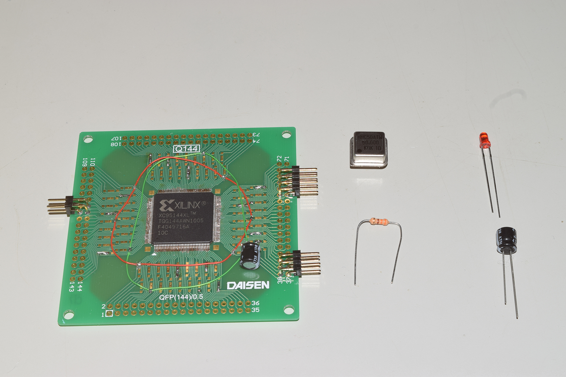 今回は使用したのはXilinx社製のXC9500XLシリーズ「XC95144XL-10TQG144」というCPLDで、