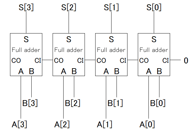 はい、これで4bit+4bitの加算機ができました。さらにbitを増やす場合も同じですね。