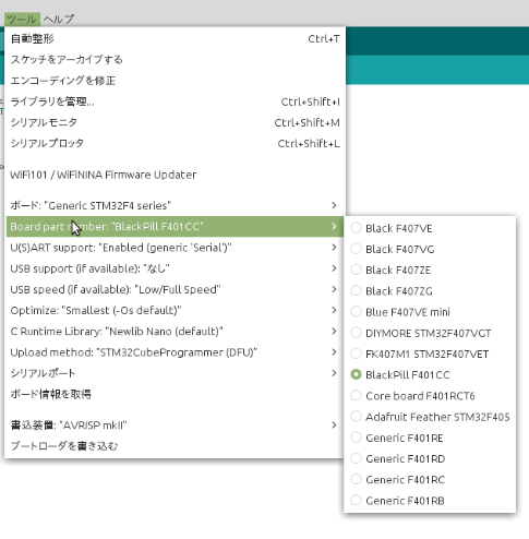 以前はこのボードはデフォルトで使えなかったのですが、見事「genericSTM32F411CE」ボードとして使えるようになりました! くわしくは →こちら