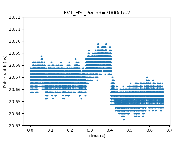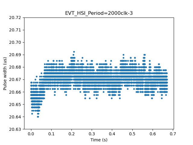グラフの縦軸はパルス幅です。理想値 20.833μs に対し、20.69μs 程度と、少し短いです。これはクロックが 24MHz より速いことを意味します。パルス幅の比較ですが、理想値に対し 0.69% 程度短い計算になります。クロック周波数の範囲が -1.2%~+1.6% ですから、この範囲には収まっています。