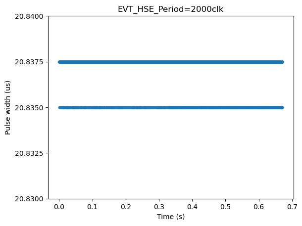 20.63μs から 20.72μs の範囲で変動するとすれば、変動幅は 0.09μs です。これは、パルス幅の理想値 20.833μs に対して 0.432% です。クロック数でいえば 4.32 クロック分に相当します。