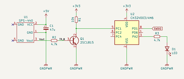 SPS-440は電源が5V必要となります。CH32V003は5Vでも動作するのでそのままSPS-440の出力を入力しても良いのですが、CH32V203のように3.3V電源の電源でも使用できるようにトランジスタを入れて、レベル変換をしています。また、SPS-440の出力も反転させています。