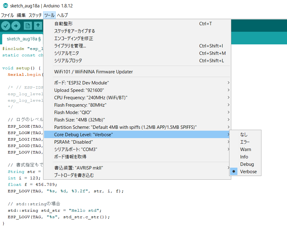 ArduinoでESPを開発するときに、デバッグログのレベル付けと、レベルに応じて表示/非表示を切り替える方法についてのメモです。