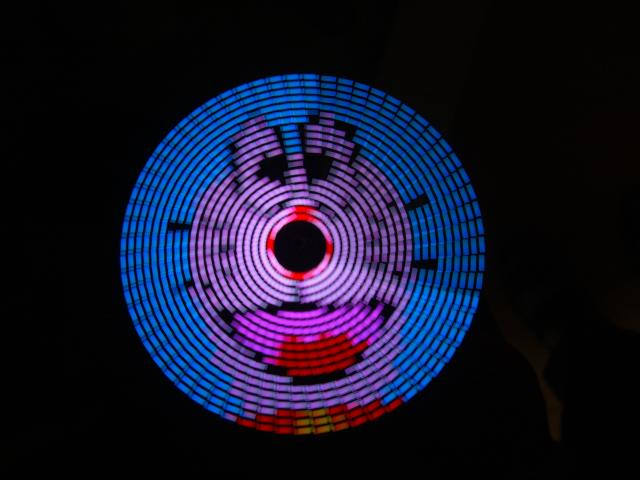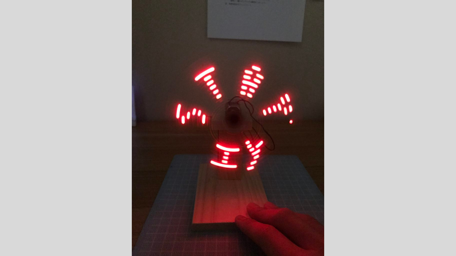 このように絵や文字を表示することができるものなのですが、これ実は一本のLEDを高速回転することで表示しています(下の写真参考)。(なんかかっこいい!そう思った私はこれを作ると決意します。)