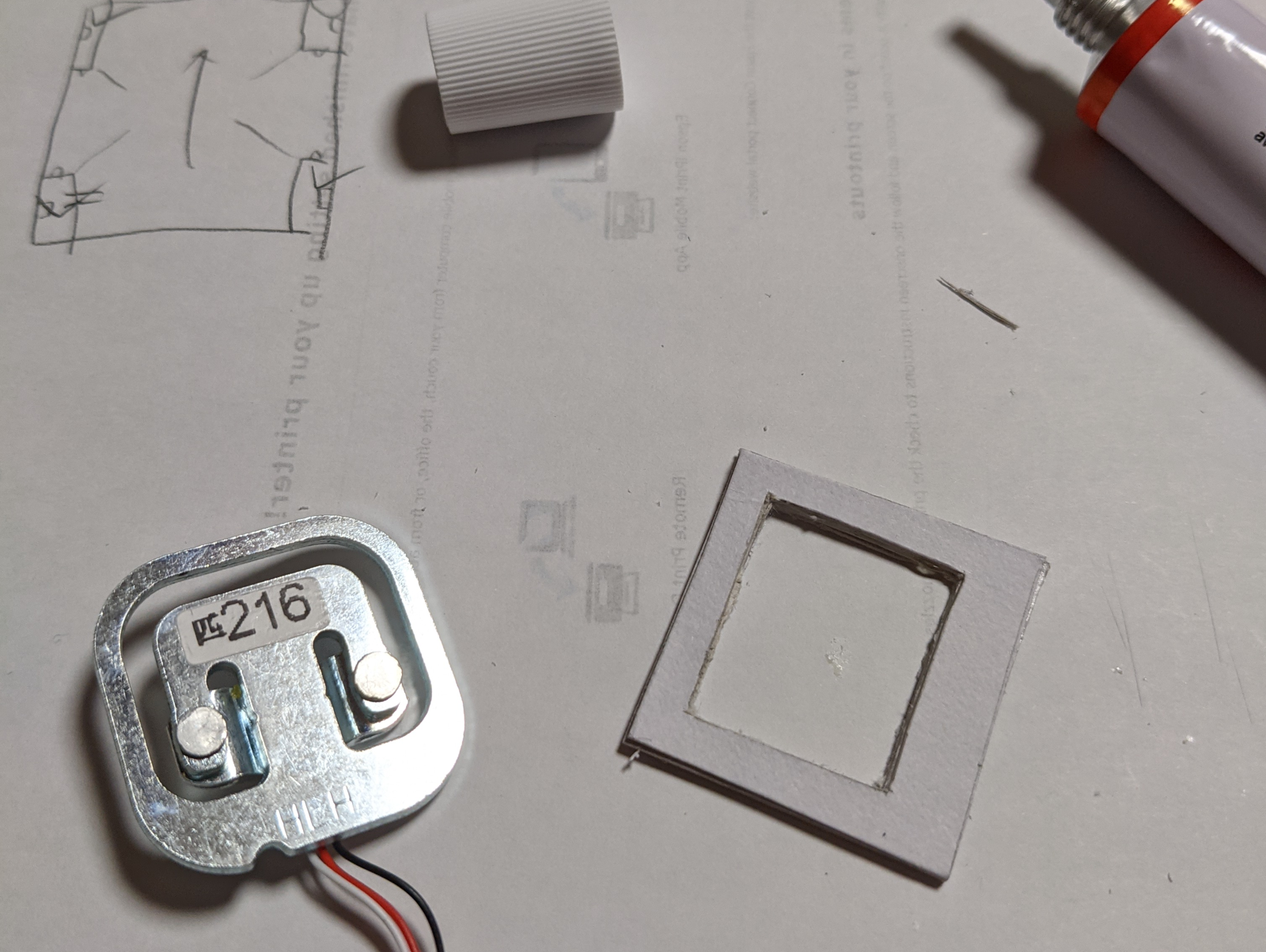 まず板目表紙で紙製のスペーサを作ります.ロードセルと同じサイズに切り取って真ん中をくり抜いた部品を3つ作って重ねるとちょうどよいです(もちろんのり付けしましょう).
