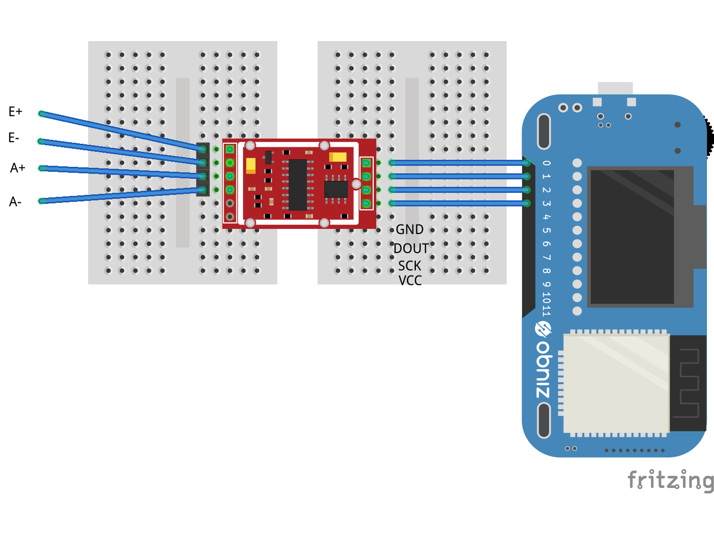 次にこれらのセンサとロードセル用ADコンバータモジュール,obniz Boardを配線します.