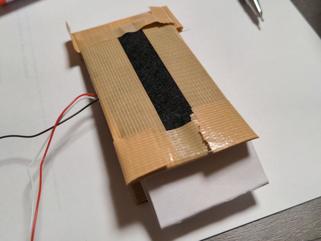 これでセンサの基本的な部分は完成です.あとは金属板の切断面や表面などでベッドに傷がつかないように,切断面に粘着テープを貼り,金属板表面にフェルトを貼り付けます.