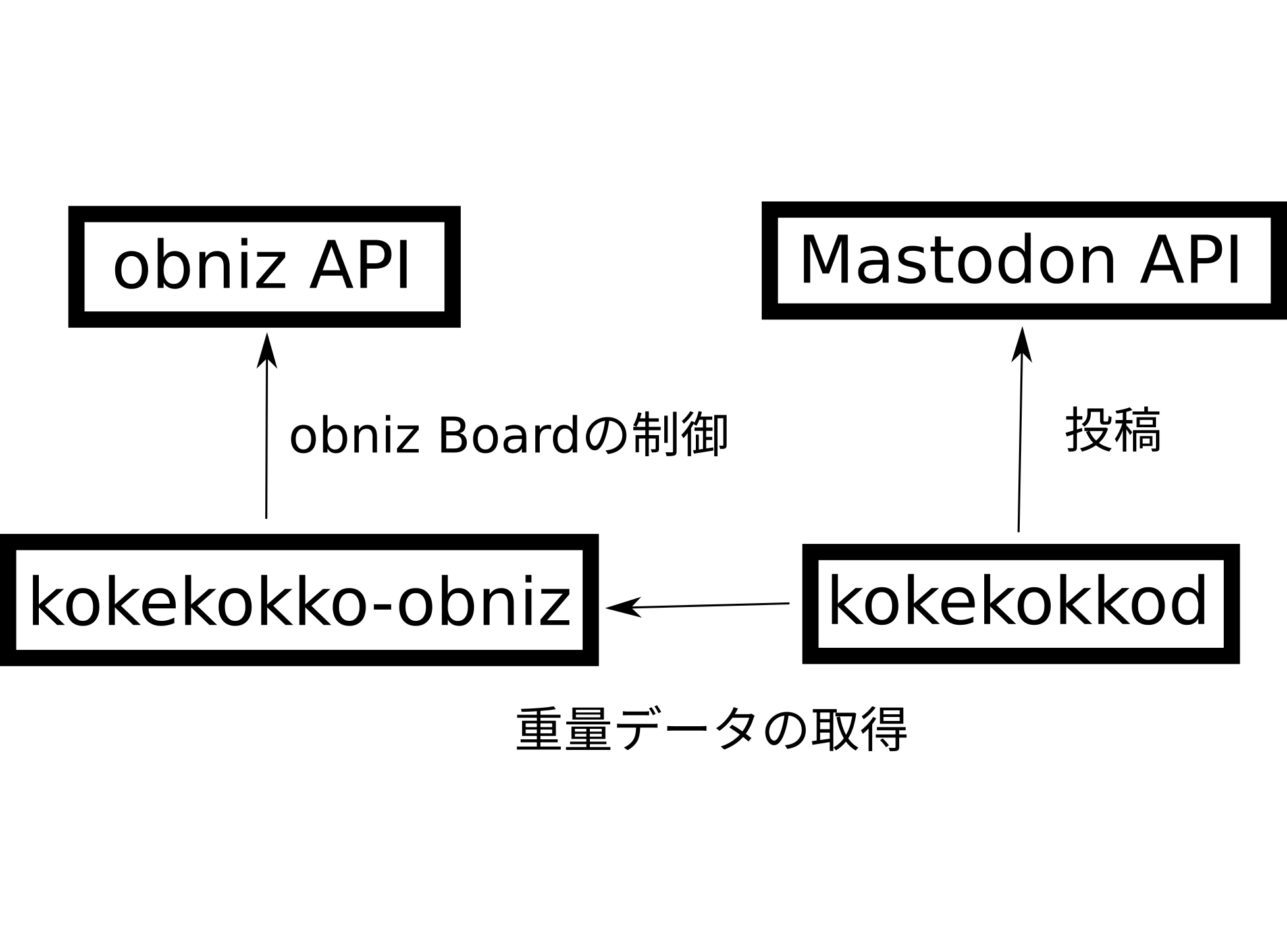 最後にソフトウェアを実装していきます.ソフトウェアの構成は次の図のようになっています.矢印の向きはAPIリクエストが投げられる方向を示しています.近くのテキストはそのAPIリクエストの内容です.