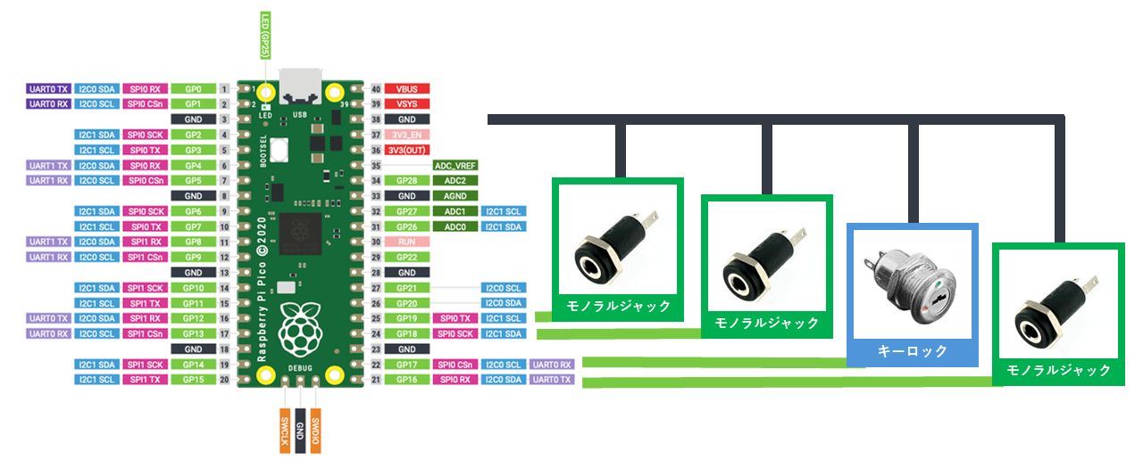 頭に、キーロック、胴に3つのモノラルジャックをつけています。
