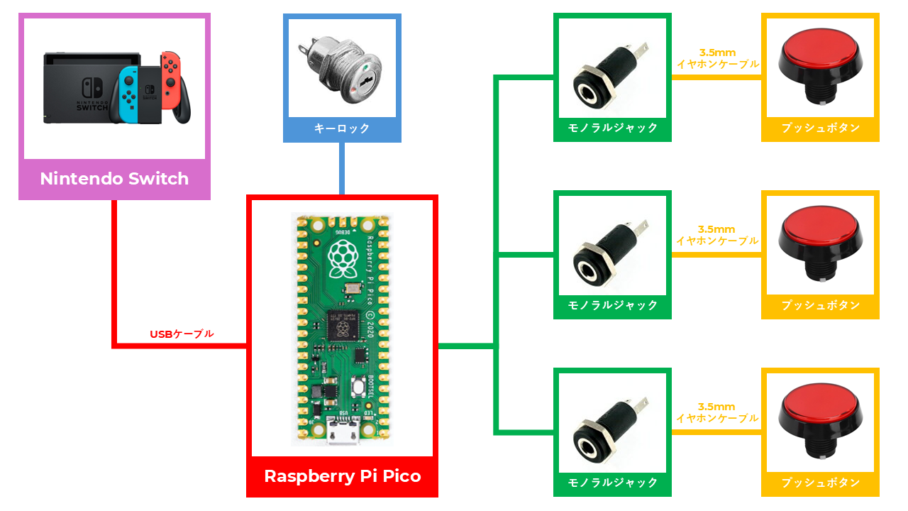 モノラルプラグ対応であればどのようなボタンでも利用可能ですが、叩き心地のある大きめなボタンを用意