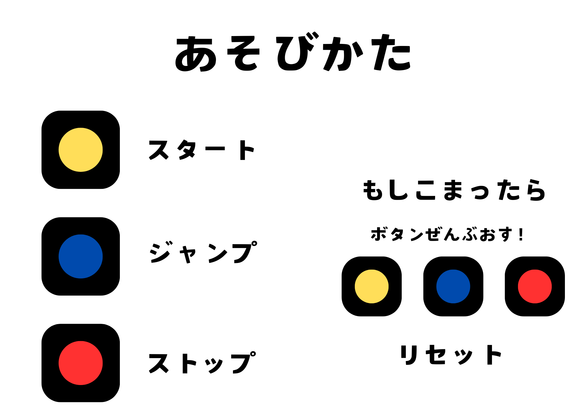 また、左移動のボタンがないため、全く動けなくなる場合もあることから、すべてのボタンを同時に押すとゲームをリセットする機能も入れています。