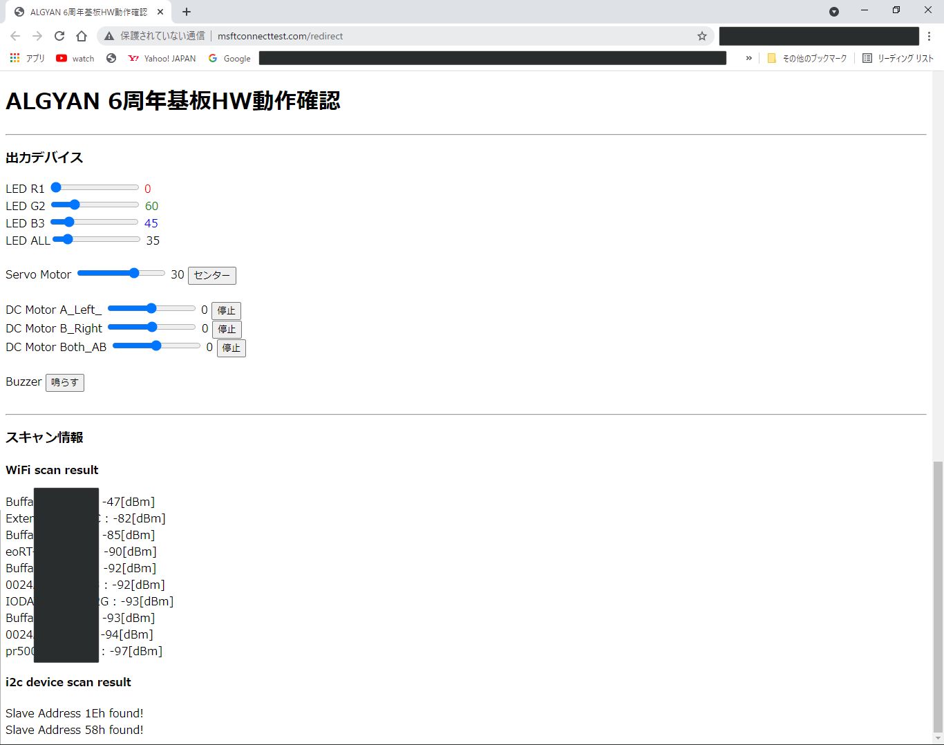 CN10 や、グローブコネクタの CN5, CN6 に接続されている、i2c デバイスを起動時にスキャンし、見つかったもののデバイスアドレス(スレーブアドレス)を表示します。
