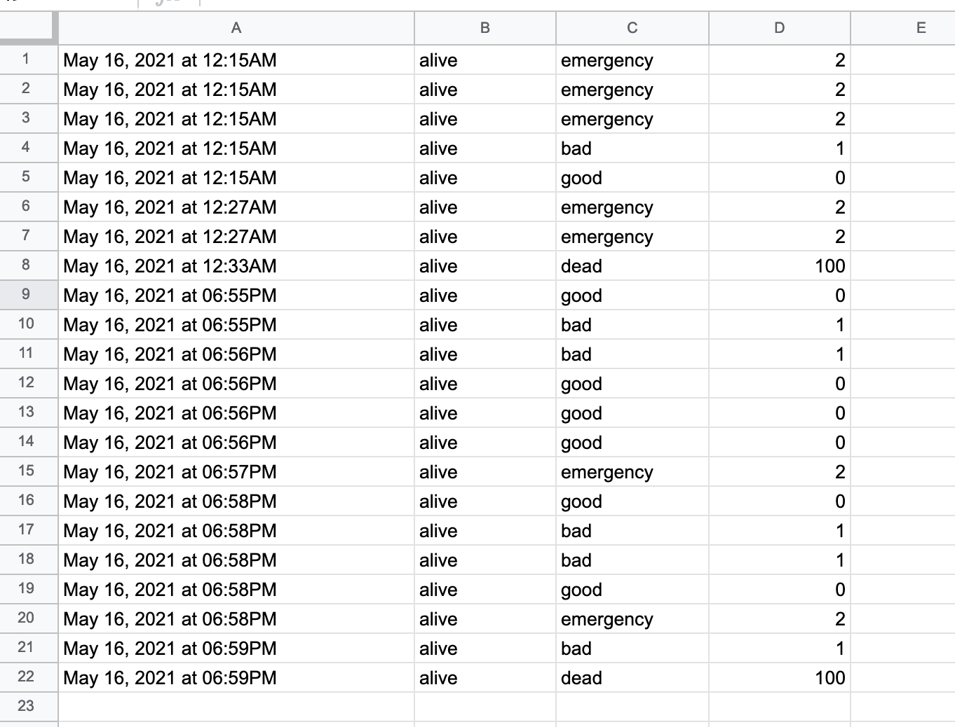 このGoogle スプレッドシートにはスクリプトが内蔵されており、もしemergency かdead の情報が記録された際には指定しておいたメールアドレスに連絡を送ります。