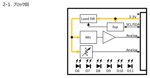 SpecSheet より、MEMSマイク、ボリューム、LEDが搭載されています。この3つを使用してみます。