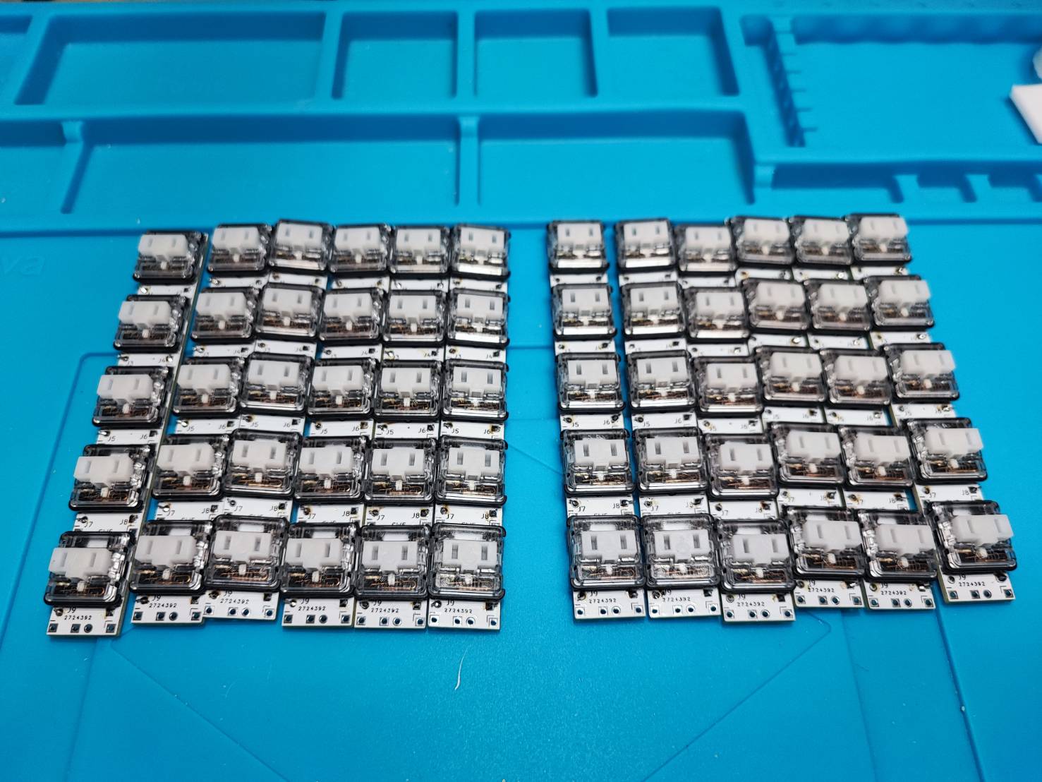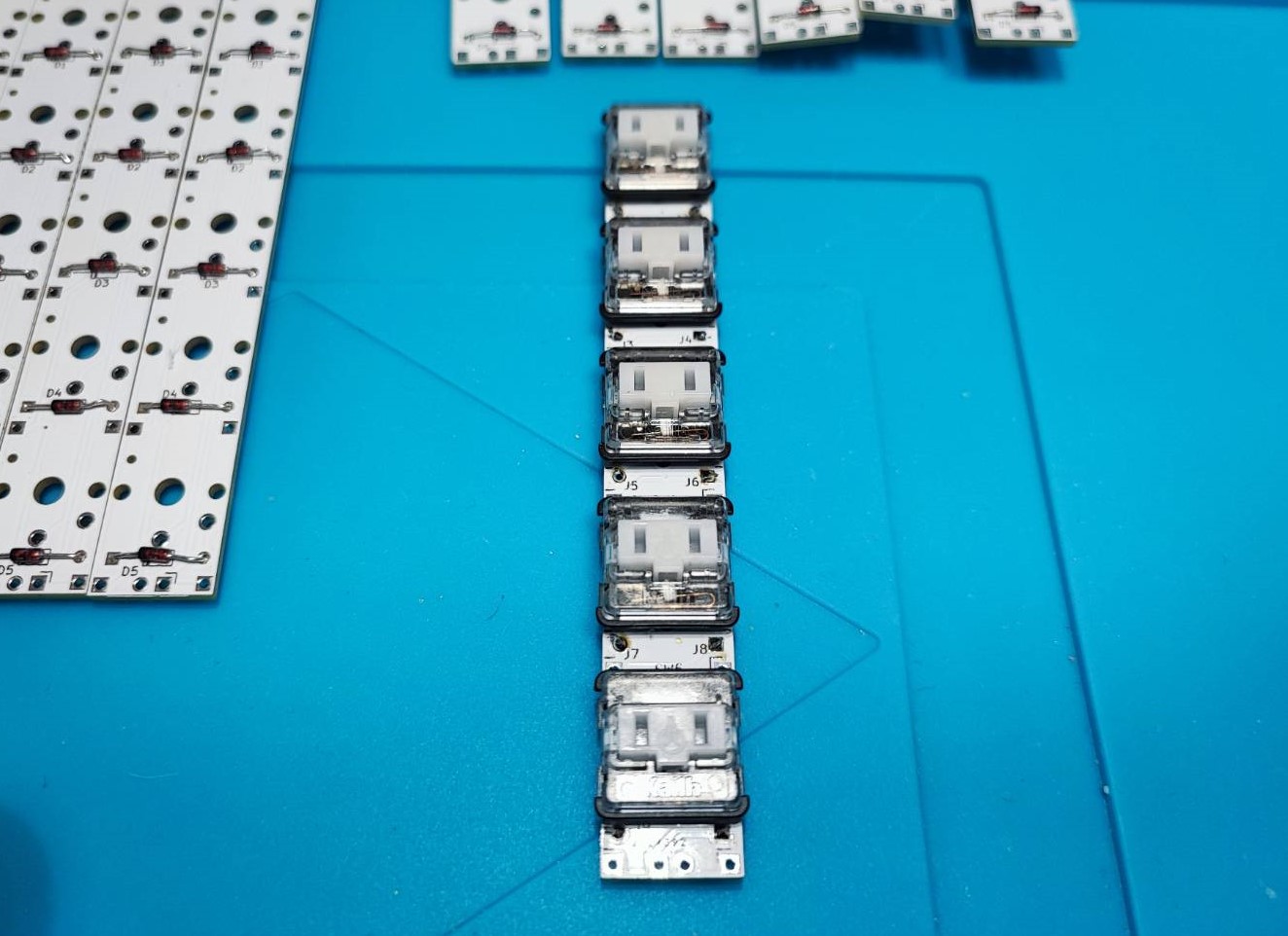 続いて12枚のkey基板に対してダイオードとは反対の面にキースイッチをはんだ付けしました。