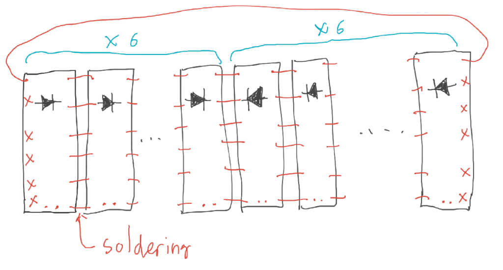 ダイオードの向きごとに分けて6枚づつハンダ付けします。