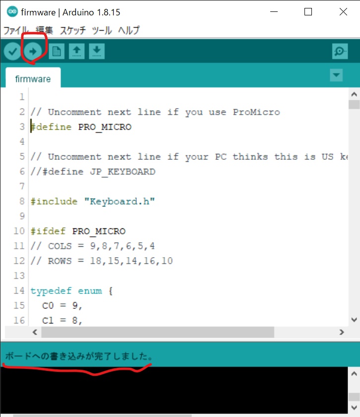 書き込みボタンを押し、コンパイル後書き込みが完了しましたと表示されれば完了です。