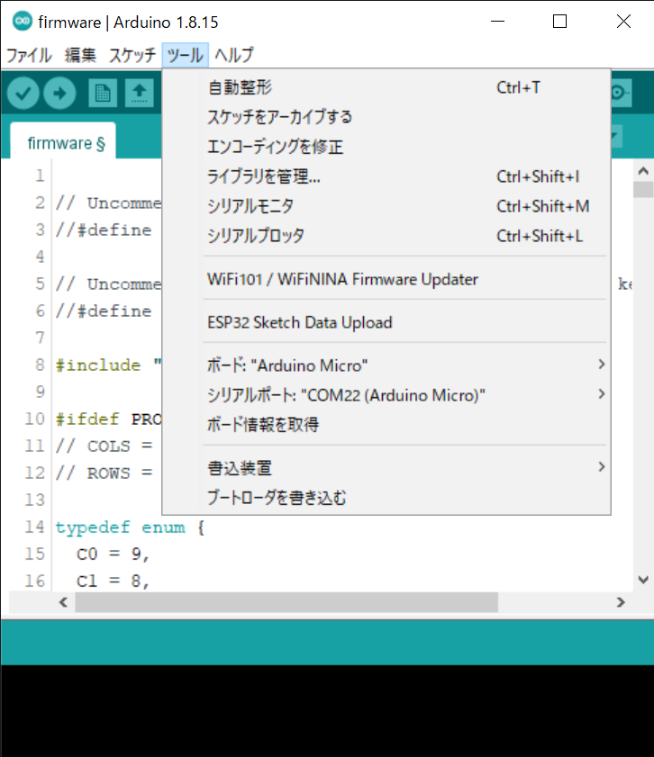 プログラムは、公開されているfirmwareに入っているfirmware.inoを使用し、ArduinoIDEで書き込みを行います。