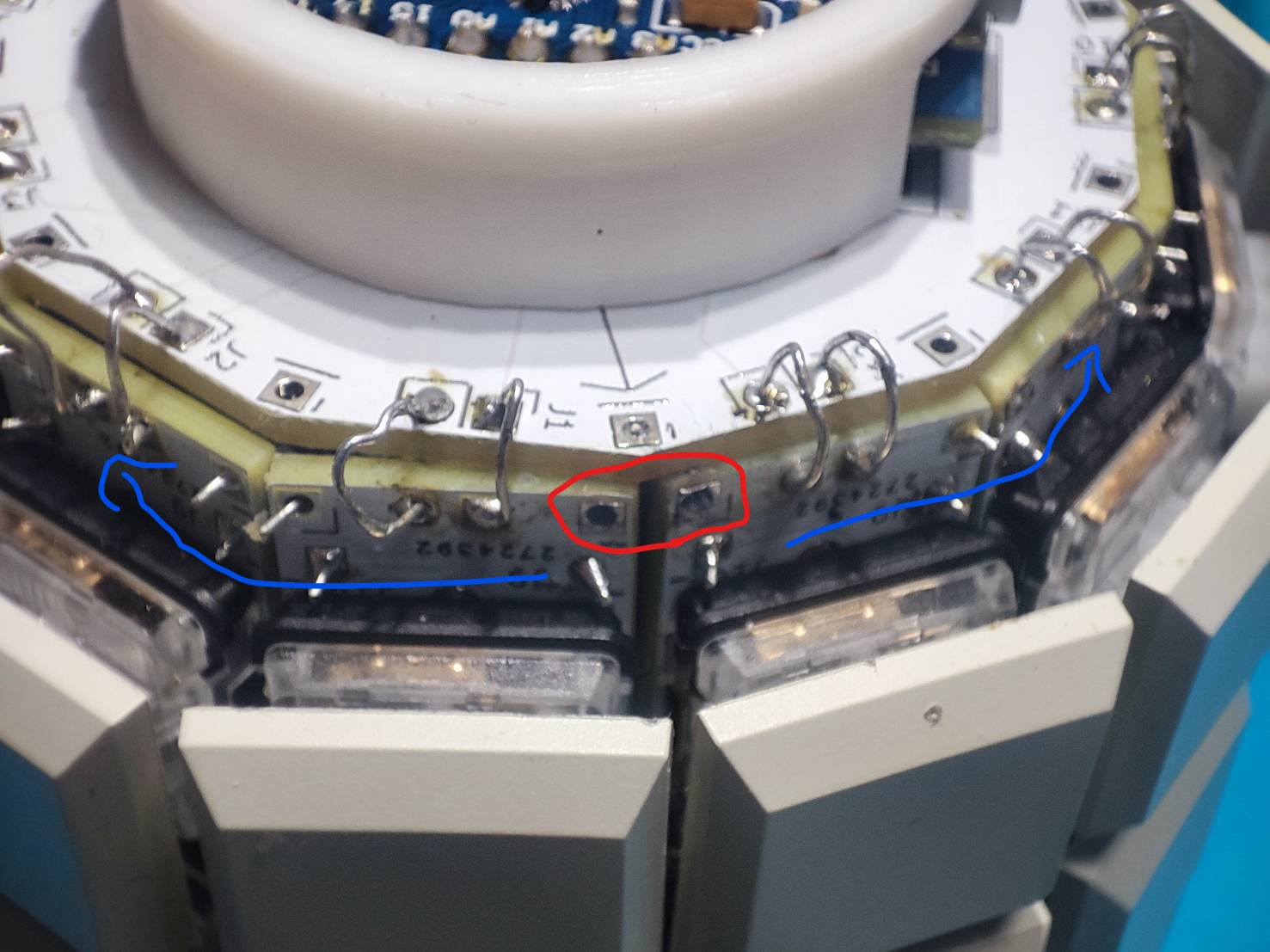 次に半円状のものを合体させますが、ダイオードが向かいあう方向につなぎ合わせ、その部分は6箇所全てはんだ付けを行います。