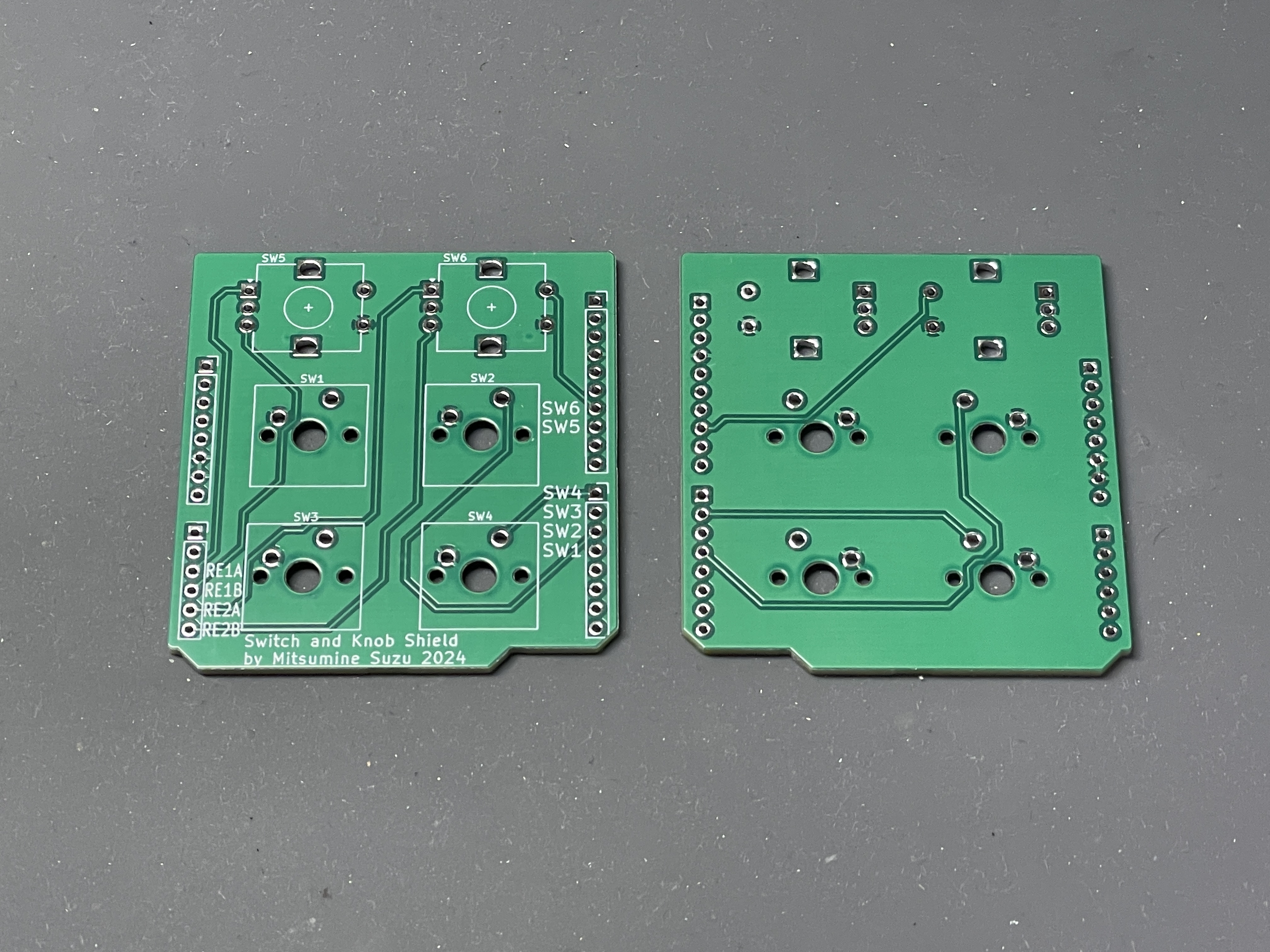 基板はArduino UNOシールドサイズです。さほど広い面積ではないので、スイッチやノブ同士の隙間があまり確保できませんでした。