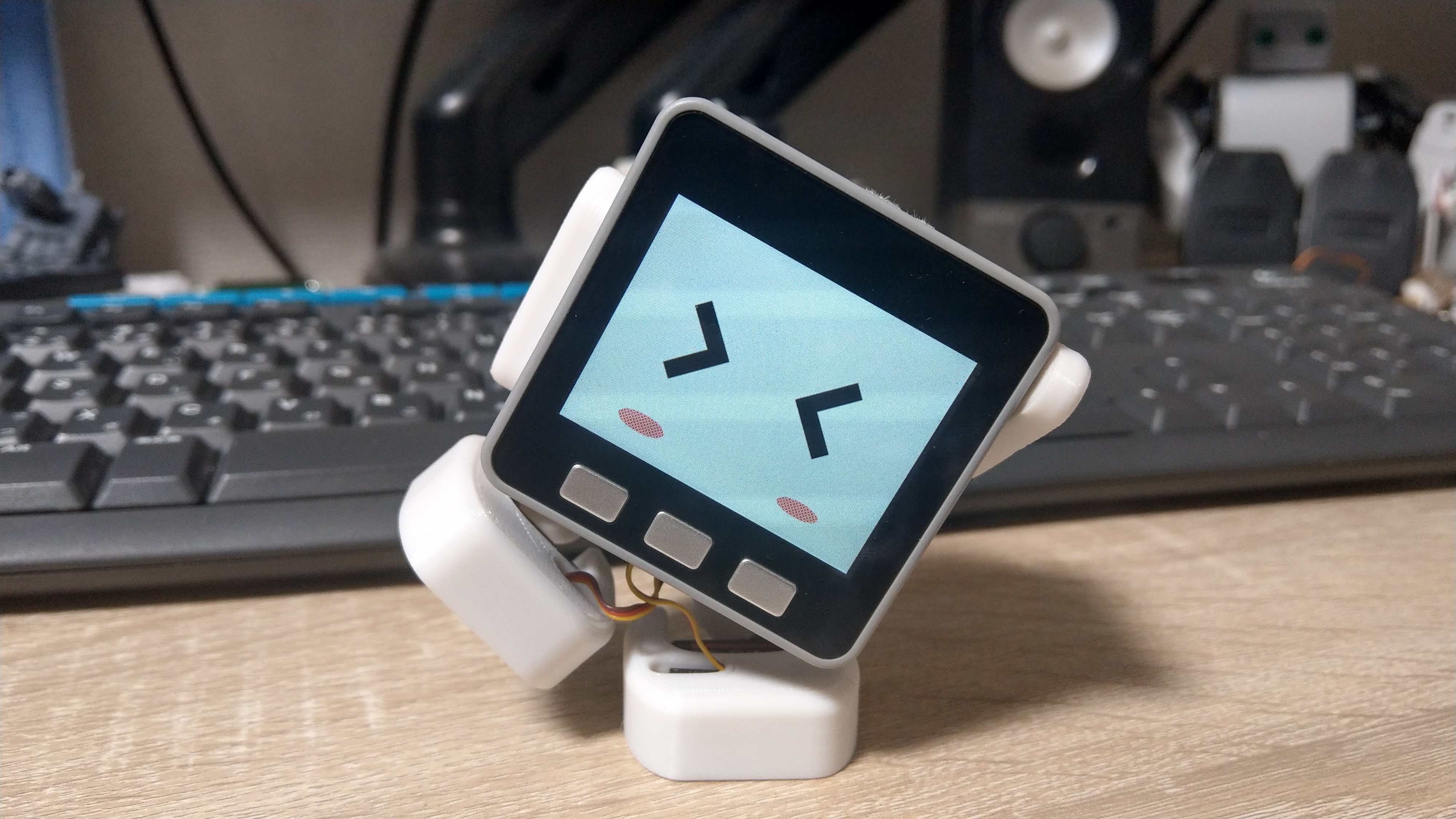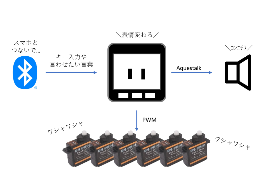 そしてそれにより合成音声を生成するAquestalkで喋らせたり、LCDで表情を変えたり、サーボを動かします。