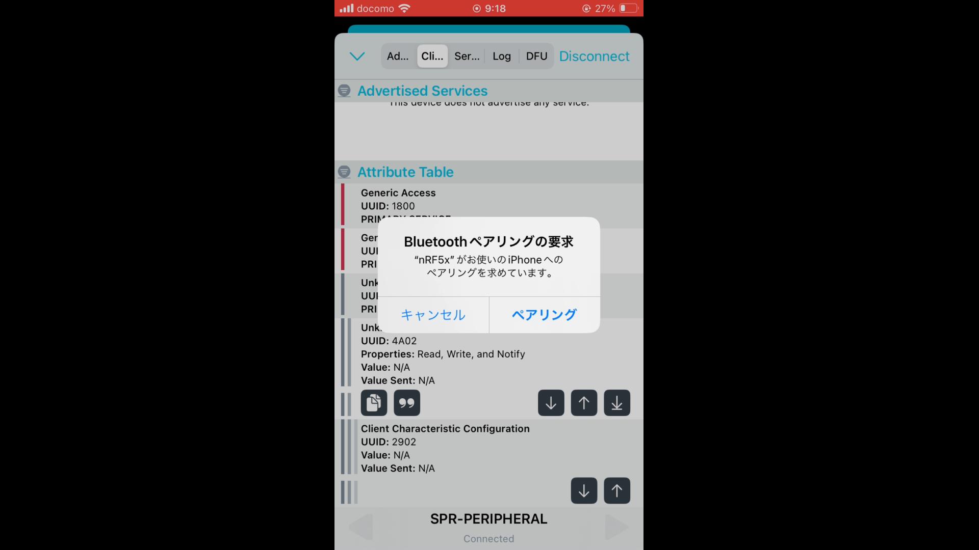 nRF connectのアプリで接続した際にすぐ切断されてしまうので、