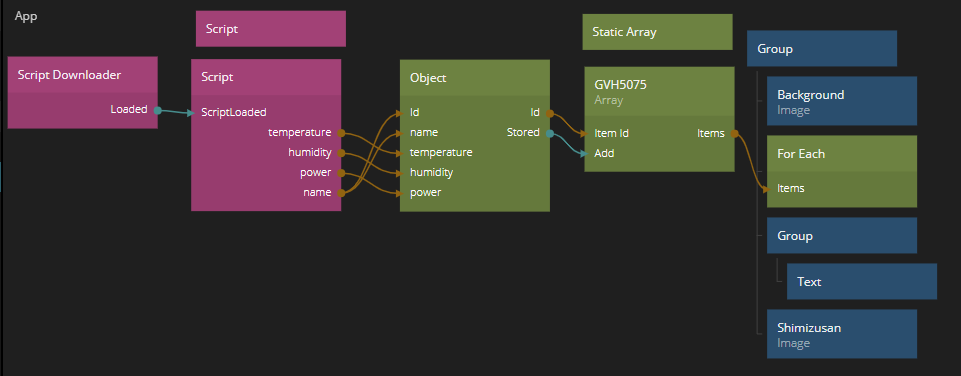 Noodl上でのビジュアルプログラミングコードは下記となります。