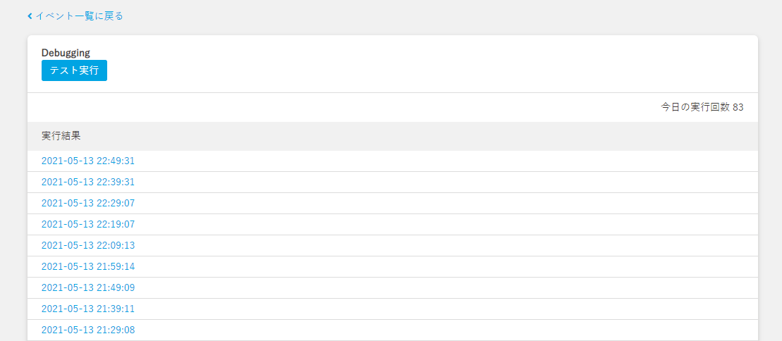 ①サーバレスイベントが上手く実行されると、実行結果に時間が表示されます。