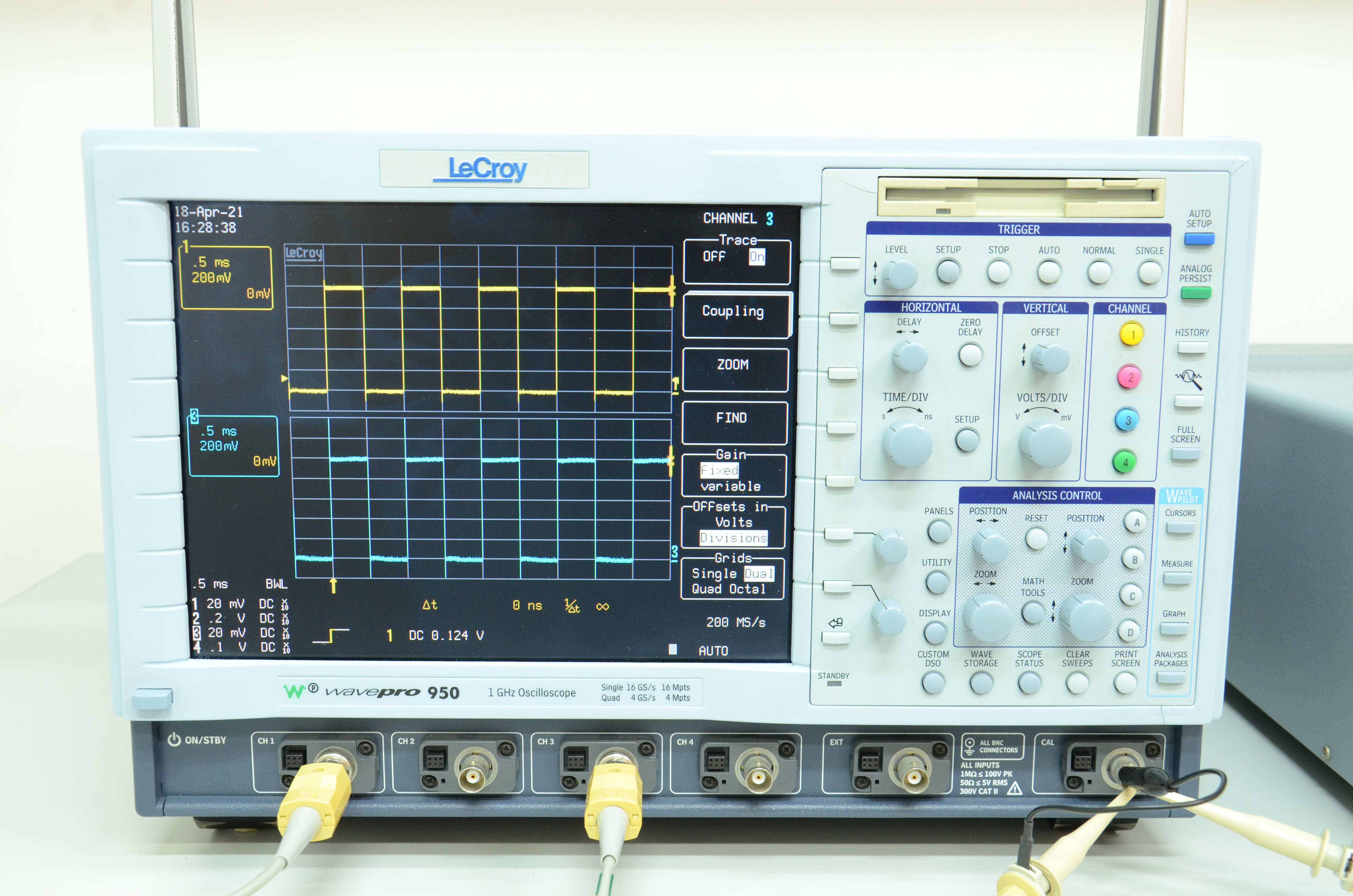 LeCroy wavepro 950 は 4 チャンネルのデジタルオシロスコープです。古い機種だからなのか、特に時間軸のつまみを回して 1 マスあたりの秒数を変化させようとすると、かなり時間がかかります。おそらく、内部的に回路を切り替えているのでしょうね、所々でリレーが切り替わる音(カチカチ、カチ、みたいな)がして、1 秒くらい時間がかかる場所もあります。