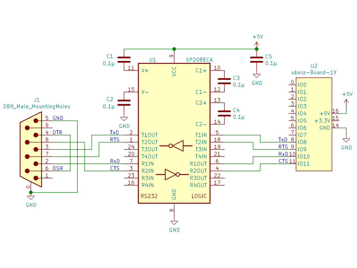 今回作成した制御基板を説明します。制御基板の目的は obniz Board 1Y の入出力電圧と RS232 の制御電圧を変換することです。obniz Board / obniz Board 1Y は、UART 機能で 5 ボルトの電圧しか出力できませんし、最高で 5V の電圧しか入力できません。しかし、RS232 ではそれより高い電圧で信号をやり取りすることになっていますので、電圧の変換が必要なのです。