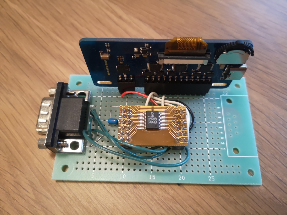 U1 が電圧変換の IC です。ロジック側(回路図右側)の電圧と、RS232 側(回路図左側)の電圧を変換してくれます。秋月電子通商の SP208ECA を使いました。