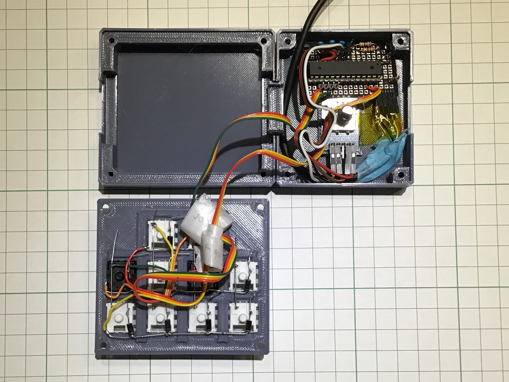 キースイッチは10個、ダイヤルが1つです。ダイヤル側のケースの内側にメイン基板を埋め込んでいます。キースイッチは天板のみで支えています(キースイッチ側に基板はなく、空中配線)。