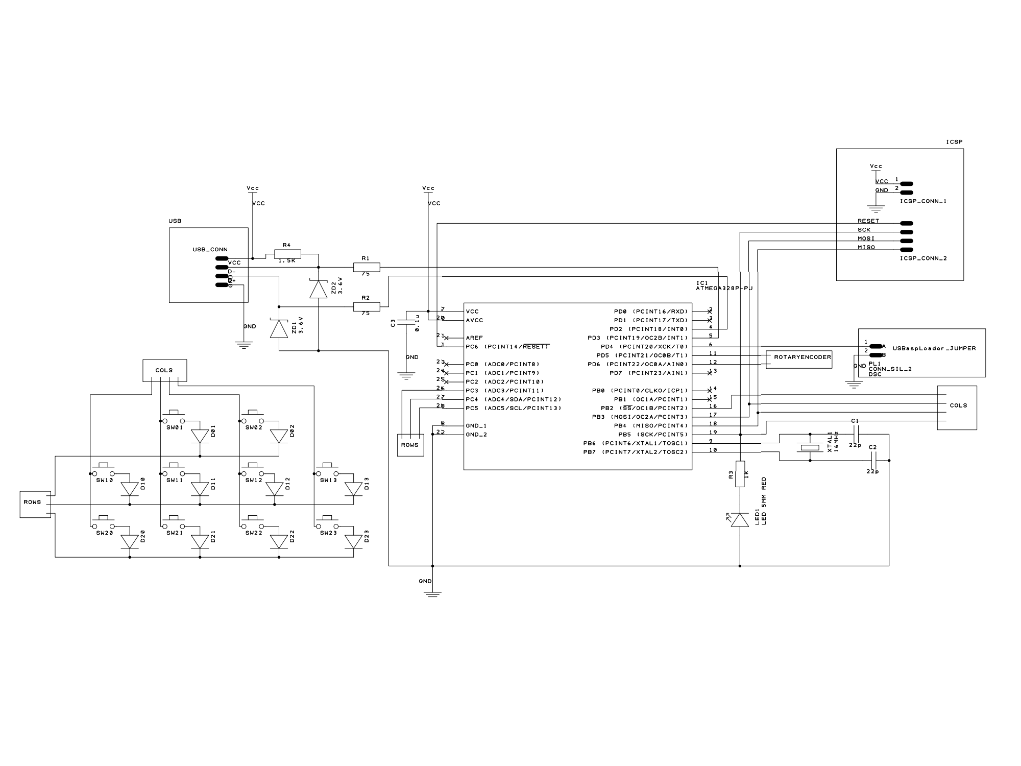 USB D-はAVRのPD3、D+はAVRのPD4へつなぎます。これはQMKのデフォルトのピンアサインですが、変更はできるようです。USBaspLoaderのデフォルトのアサインとは異なるので、そちらでは設定の変更が必要です。