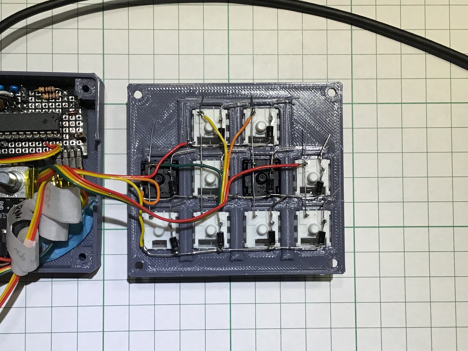 キーマトリクスは1回間違えて、全て配線しなおしてます(ダイオードを挟む位置を間違えた)。回路図を見ずに配線するのが悪い。