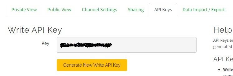 また、Write API Keyをメモしておきます。プログラムの中で利用します。