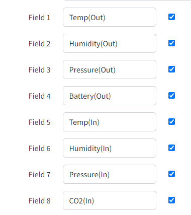 ThinkgsSpeakにアカウント作成を行います。無料で利用できる範囲で利用します。チャネルを作成しておき、以下のようにデータフィールドを設定します。