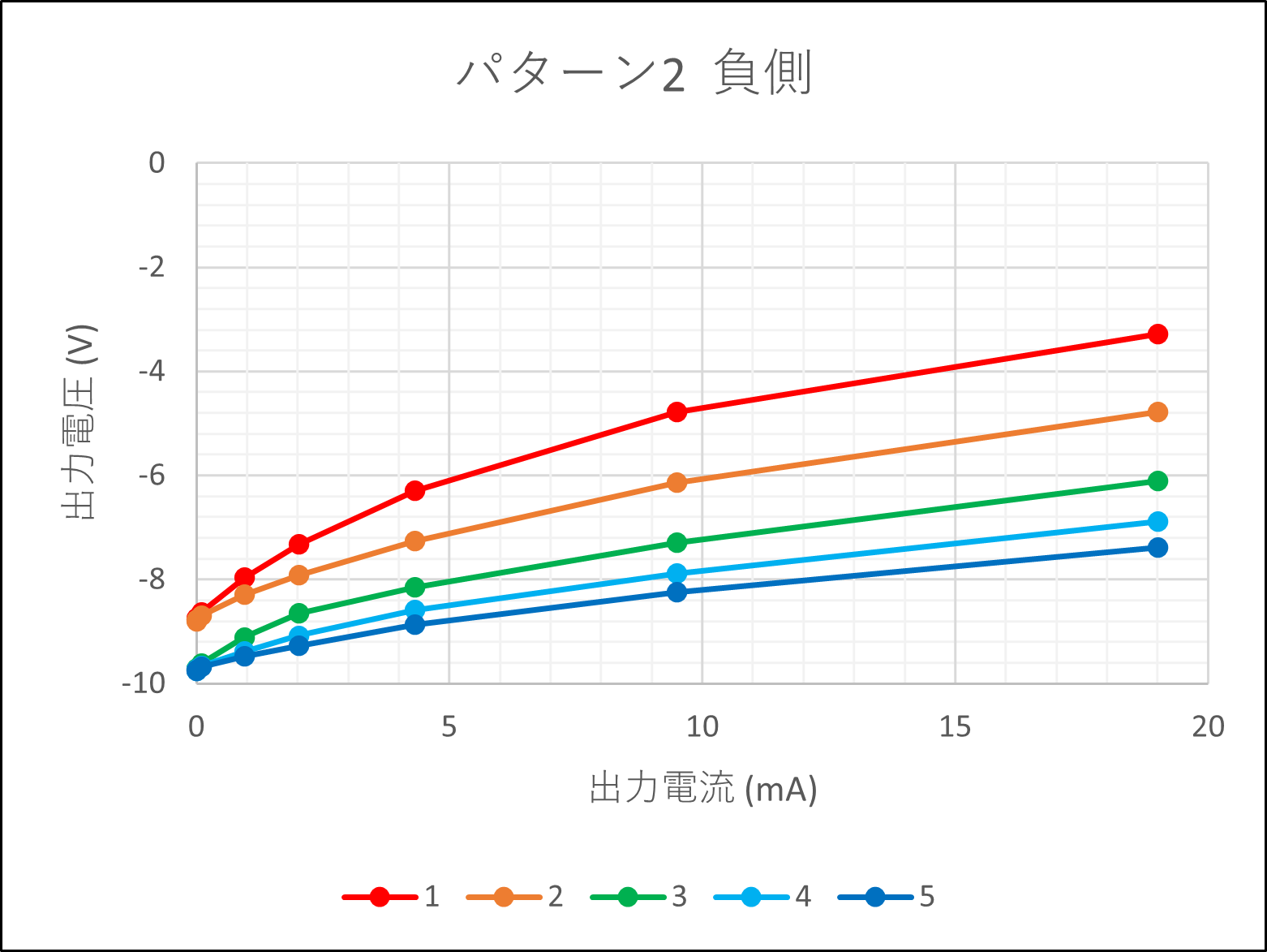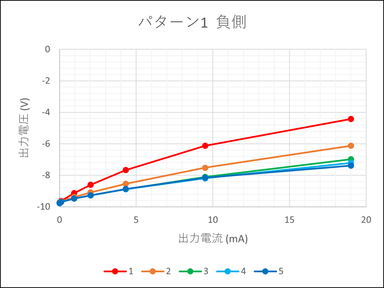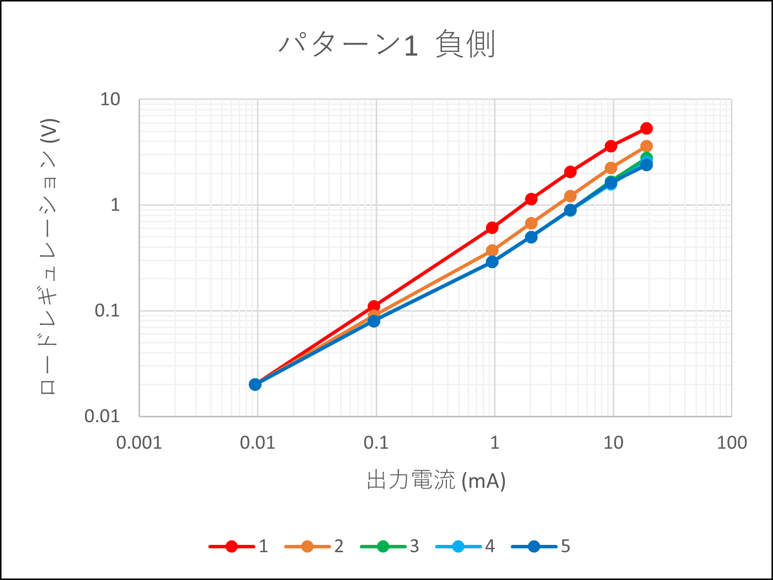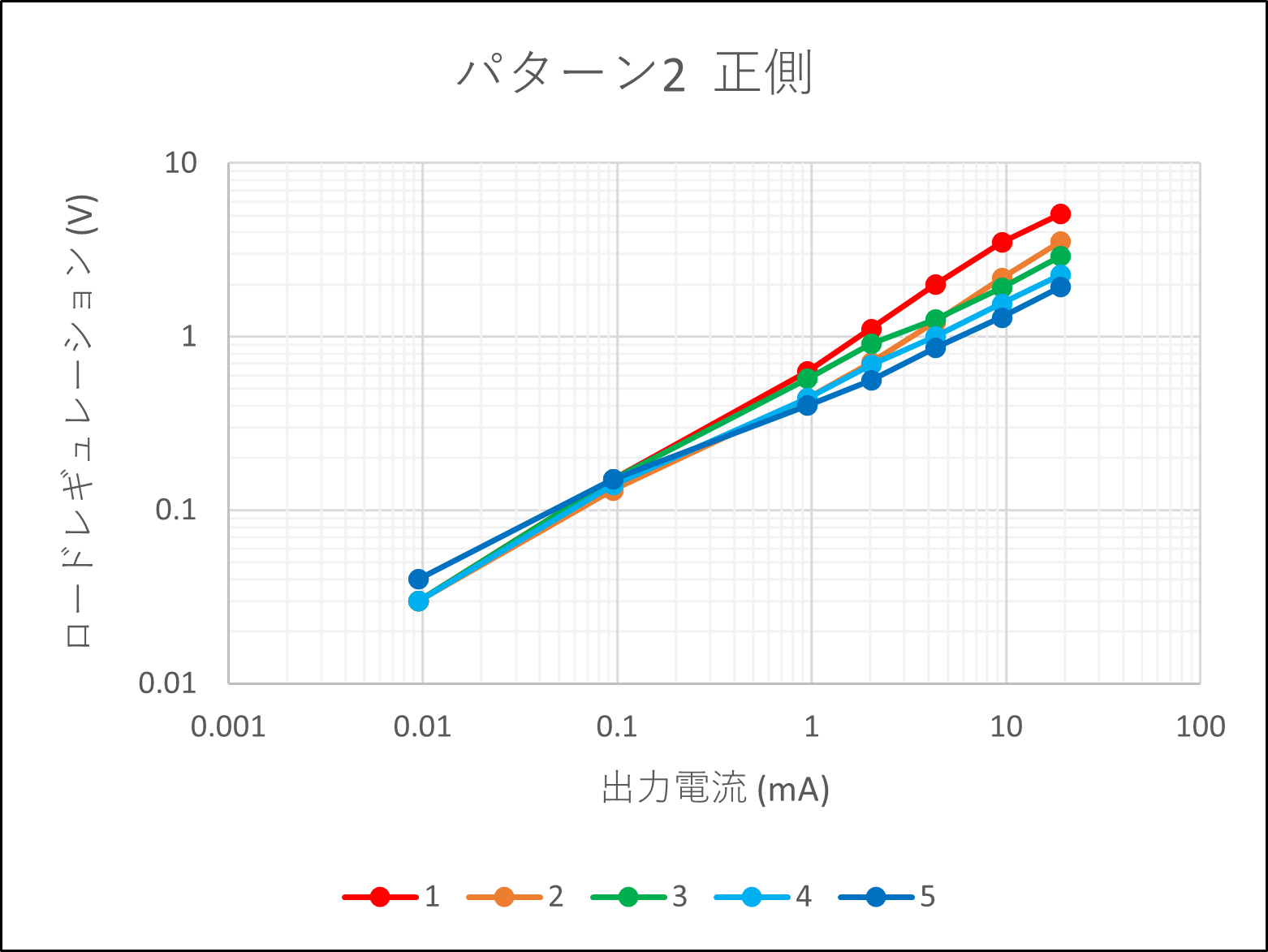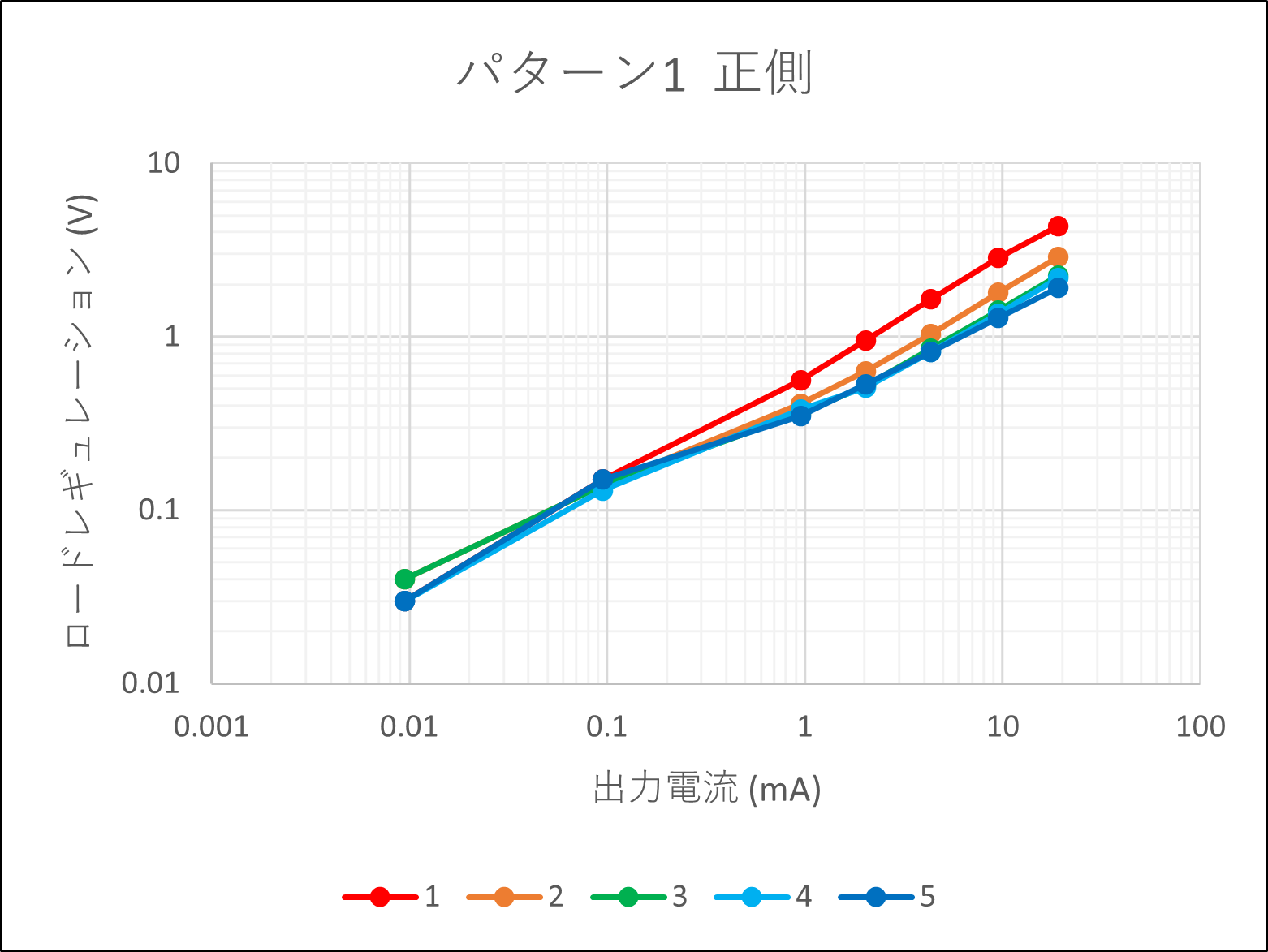 また、出力電流=0.0095mAのときに着目すると、パターン1では並列数が増えるとロードレギュレーションが低下しているのに対し、パターン2では逆にロードレギュレーションが上昇していることが読み取れるが、並列数変化に対するロードレギュレーションの変化量0.01Vが、テスターの測定精度0.01Vと等しいため、並列接続数増加に対する回路特性の変化、というよりも、テスターの測定精度に起因した変化であると考えられる。