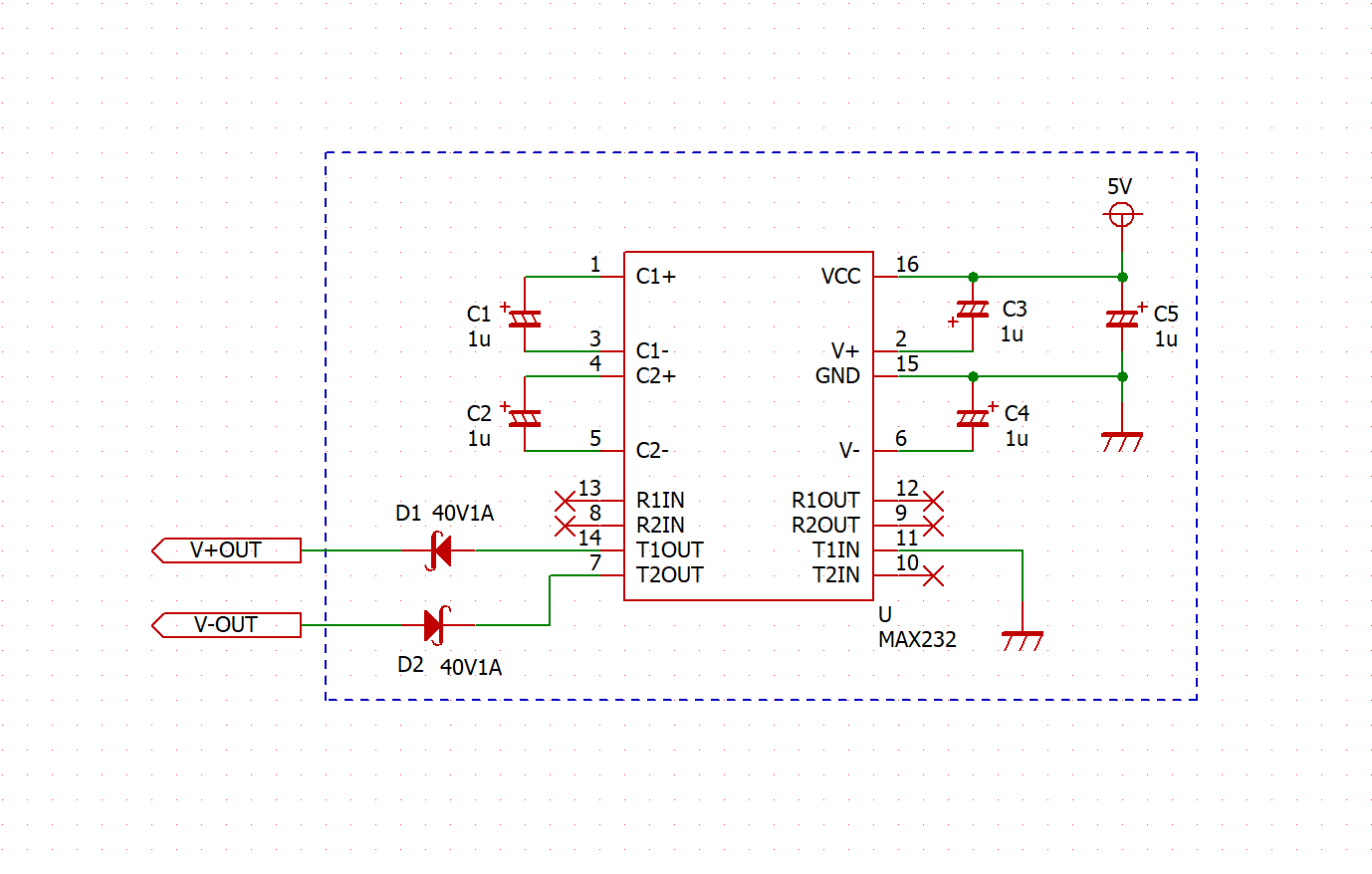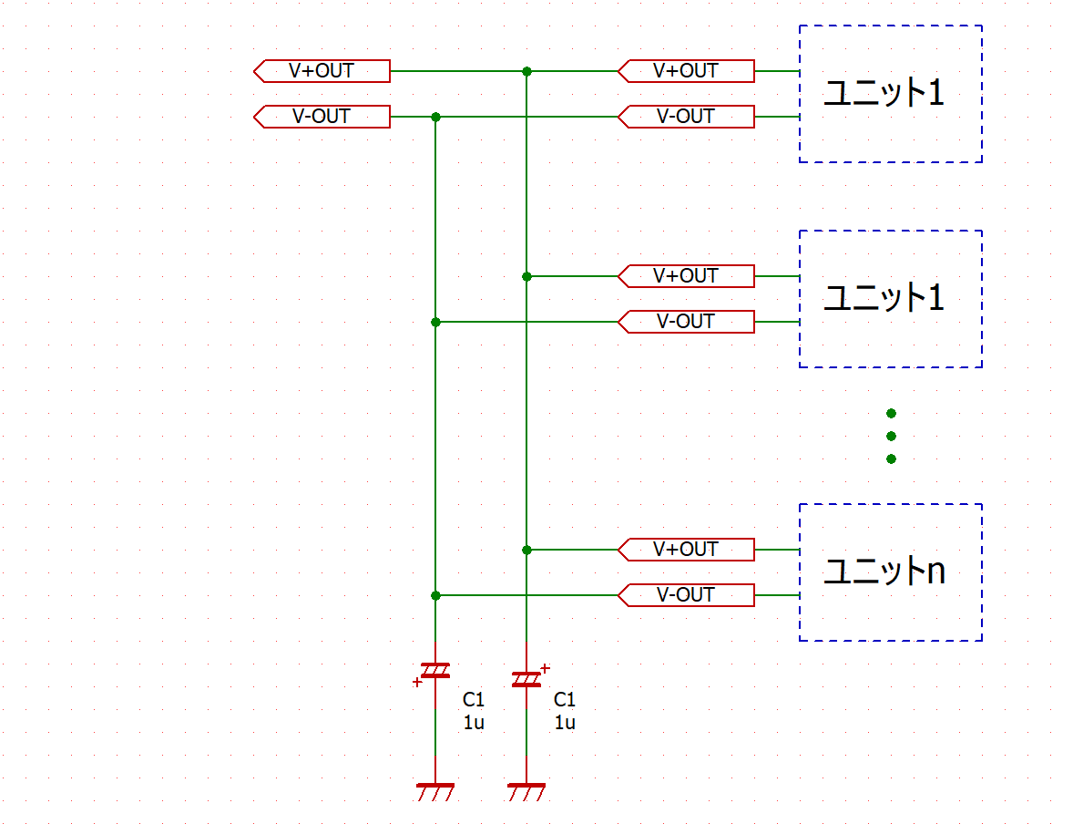 本記事では、下図のようなユニットを複数準備し、各ユニットのV+OUT/V-OUT同士を接続することでMAX232の並列数を増やした。前回記事では出力コンデンサをユニットごとに接続していたが、今回は並列接続した部分(各ユニットのショットキーバリアダイオードの先)に、1個だけ接続している。また、前回は実験回路をすべてブレッドボード上に実装していたが、今回はユニット数が増えるため、各ユニットは次節で説明する実験用ボード上に実装し、ユニット間の接続のみブレッドボードで行った。