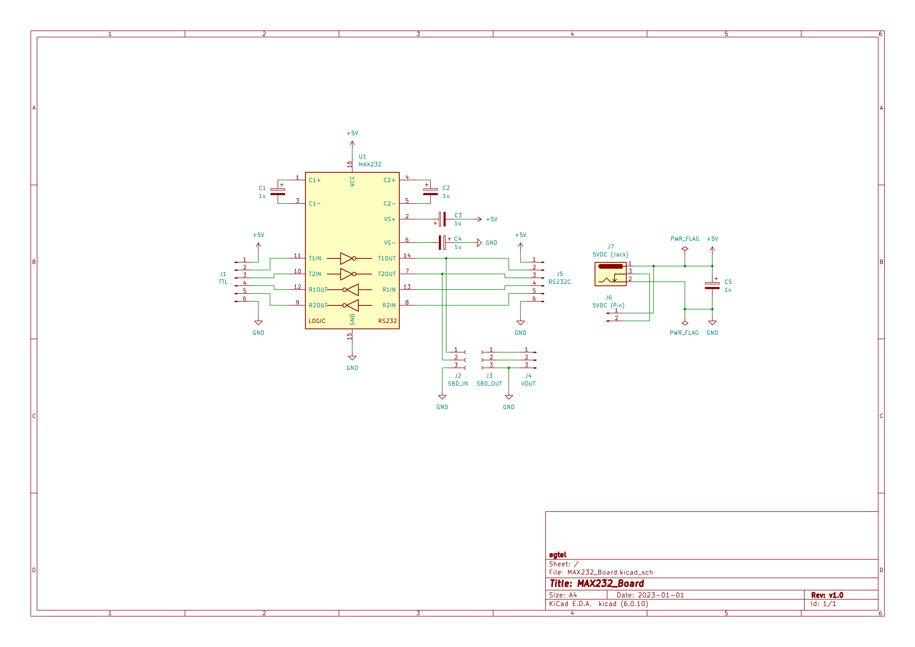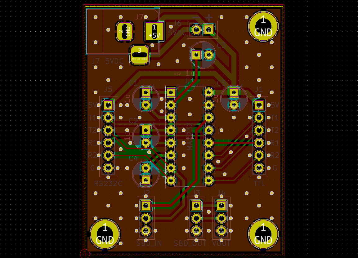 同じ回路を最大5個作成することから、下図のような実験基板を作成した。回路図のJ2, J3はピンソケットで、対応する端子同士でショットキーバリアダイオードを接続することにより、先述の実験用回路を作成することができる。また、RS232C-TTL間インターフェースとしても使用できるように、入出力端子はすべてピンソケットで引き出せるようにした。この回路をPCBに起こしその上に実装することでユニットを作成した。