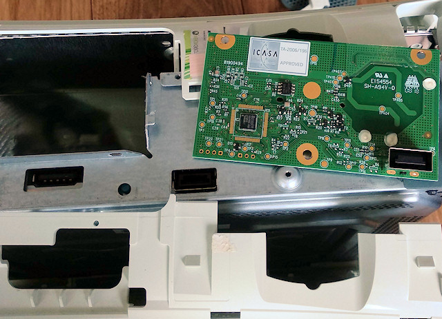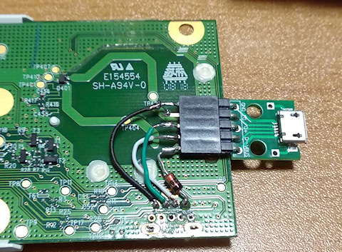 電源ボタンの真裏にある基板にレシーバーモジュールが組み込まれています。この基板の写真右下にあるコネクターがUSBにつながっているので、100円均一などで買ってきたUSBケーブルをはんだ付けしていきます。