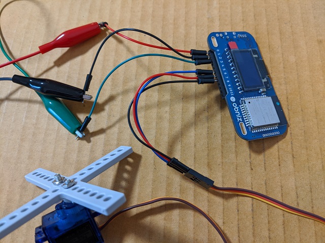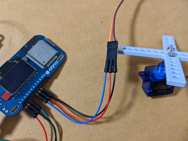 - サーボモータにジャンバーワイヤーを接続し、obnizに接続する