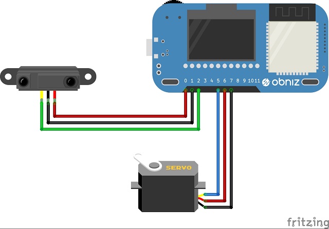 下の図のようにobnizに測距センサーとサーボモータを接続します。