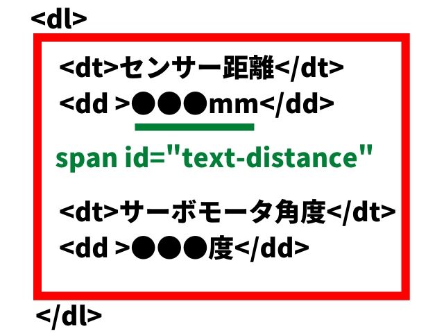 ddタグには測距センサーとの距離、サーボモータの角度を表示し、JavaScriptで値を書き換えます。