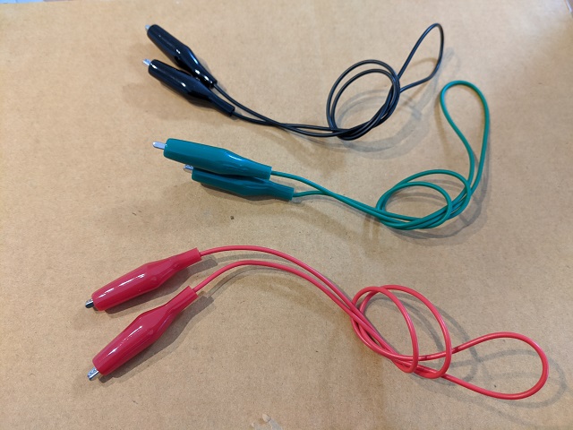 白い信号線(Vout)には緑のクリップコード、茶色いGND線には黒のクリップコード、黒い電源線(Vcc)には赤のクリップコードを接続します。